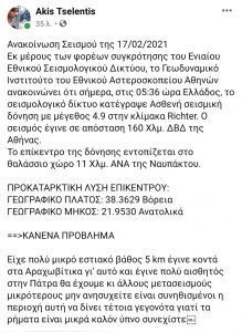 Ο Καθηγητής Σεισμολογίας και Διευθυντής του Γεωδυναμικού Ινστιτούτου της Αθήνας Άκης Τσελέντης υποστηρίζει ότι δεν υπάρχει ανησυχία από την νέα σεισμική δραστηριότητα στον Κορινθιακό κόλπο.