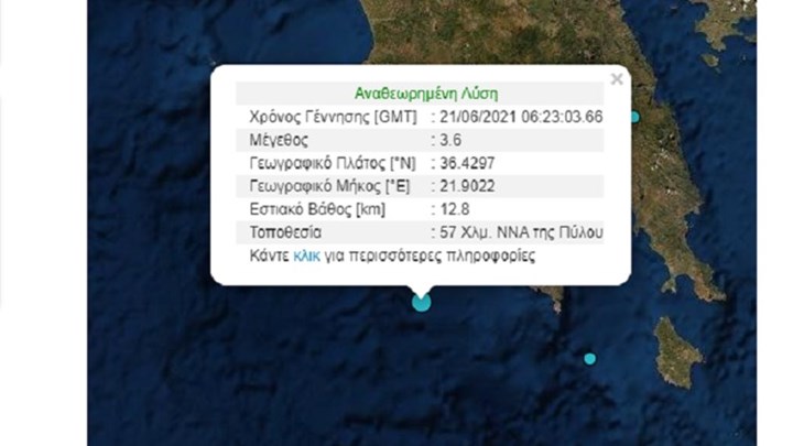 Σεισμός 3,6 Ρίχτερ έγινε πριν από λίγο στην Πύλο, συγκεκριμένα στον θαλάσσιο χώρο 57χιλιόμετρα νοτιο-ανατολικά της πόλης. Σύμφωνα με την μέτρηση του Γεωδυναμικού Ινστιτούτου, το εστιακό βάθος εντοπίζεται στα 12,8 χλμ..