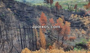 Εξειδικεύοντας την αναφορά του αυτή τόνισε ότι “… αναφέρομαι στα ξυλοφράγματα, τα ξυλοδέματα, και τα κορμοδέματα. Αυτά τα οποία υλοποιούμε στην ορεινή ζώνη και φιλοδοξούμε ότι από την επόμενη εβδομάδα ίσως και την μεθεπόμενη θα αρχίσουμε και την κατασκευή τους. Τα έργα αυτά είναι αρκετά σημαντικά προκειμένου να μην έχουμε πλημμυρικά φαινόμενα. Ευτυχώς αυτές τις τελευταίες ημέρες οι βροχοπτώσεις που έπεσαν στην περιοχή μας ήταν τέτοιες που απομάκρυναν αυτό το στρώμα της σταχτής που δημιουργούσε πρόβλημα στον εμποτισμό του υδροφόρου ορίζοντα από το νερό. Άρα, οι βροχές που πέφτουν πλέον απορροφούνται από το έδαφος και με την θερμοκρασία την οποία είναι αρκετά υψηλή για την περιοχή μας έχουμε ήδη την πρώτη φυσική αναγέννηση η οποία αρχίζει και καλύπτει δειλά δειλά αυτές τις καμένες εκτάσεις. Άρα, αλλάζει την εικόνα αυτής της καμμένης περιοχής. Πιστεύουμε ότι αν συνεχιστεί έτσι ο καιρός, τα πλημμυρικά φαινόμενα να μην είναι τόσο δυνατά”.