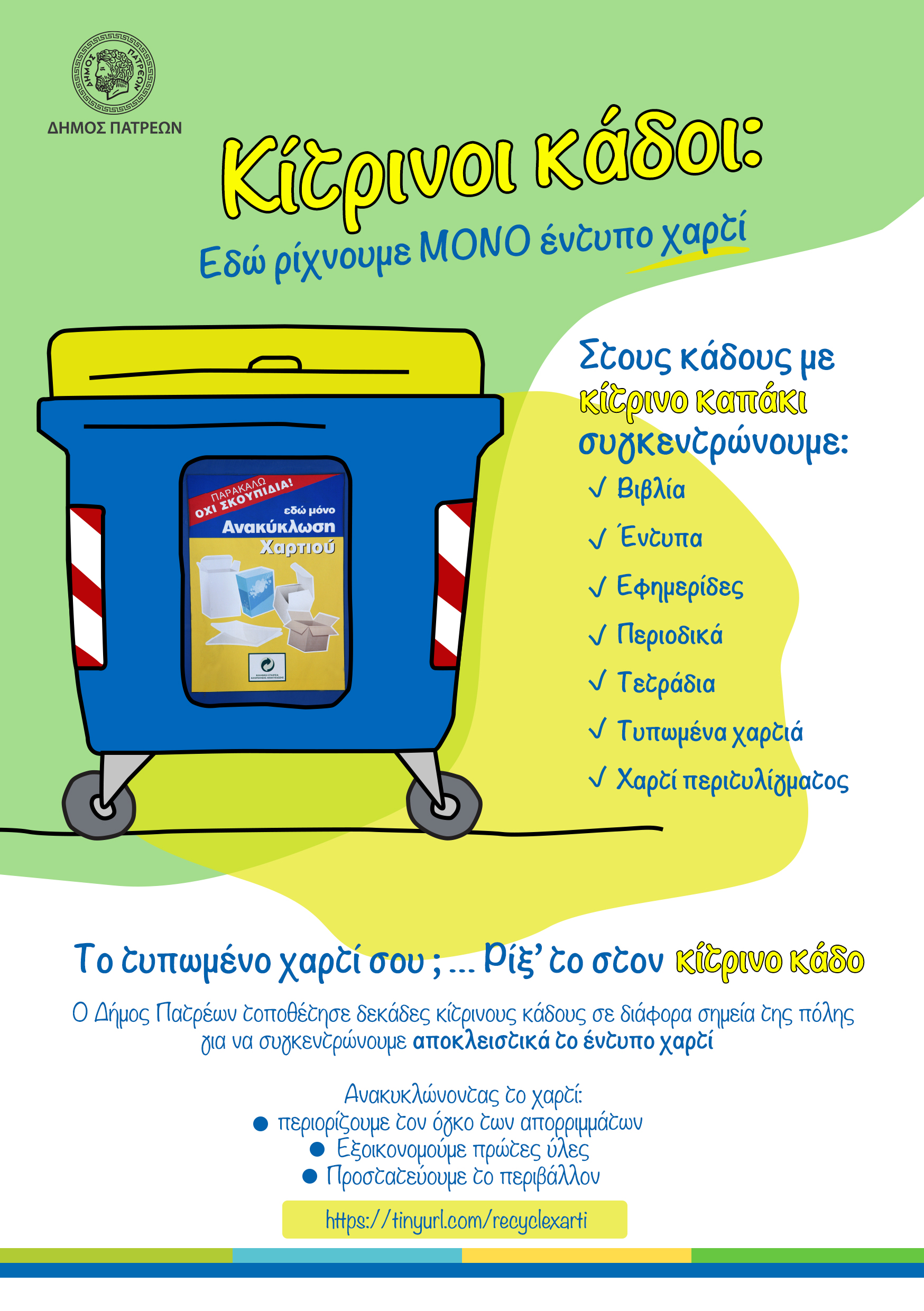 Ο Δήμος Πατρέων γνωστοποίησε την πρόθεσή του να τοποθετήσει κίτρινους κάδους ανακύκλωσης χαρτιού στα σχολεία της πόλης και ήδη ανταποκρίθηκε μεγάλος αριθμός από αυτά, στα οποία και θα γίνει η διαδικτυακή ενημέρωση.