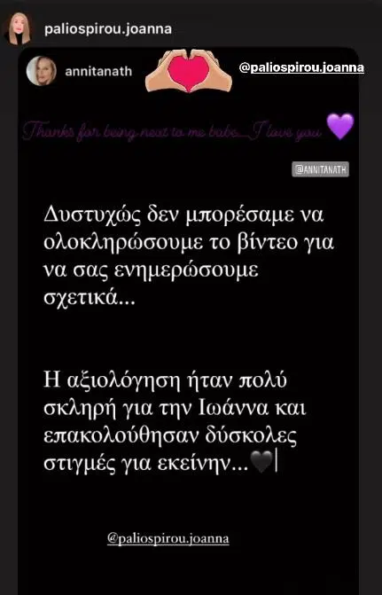 Η Αννίτα Ναθαναήλ, η οποία βρίσκεται μαζί της στο Παρίσι, δημοσίευσε στον λογαριασμό της στο Instagram βίντεο με την Ιωάννα από την στιγμή που εισέρχεται στο στρατιωτικό νοσοκομείο “Percy Army Training Hospital” και κατευθύνεται στους γιατρούς που θα έκαναν την αξιολόγηση των τραυμάτων της.