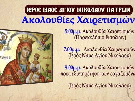 Τρεις Ακολουθίες των Χαιρετισμών της Θεοτόκου θα τελεστούν και αυτή την Παρασκευή 18 Μαρτίου στην Ενορία του Αγίου Νικολάου στην Πάτρα. Στις 5 θα ψαλεί η Ακολουθία των Χαιρετισμών στο παρεκκλήσιο τψν Εισοδίων. Στις 7 στον Άγιο Νικόλαο και στις 9 επίσης στον ναό του Αγίου Νικολάου έχει προγραμματιστεί η Ακολουθία για την εξυπηρέτηση των εργαζομένων.