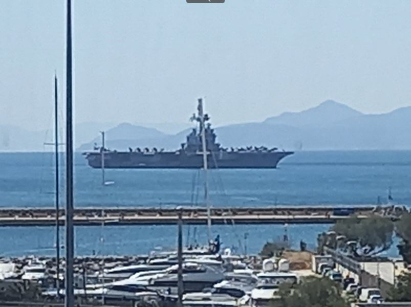 Δίνοντας πανηγυρικό τόνο στην τελετή, στον φαληρικό όρμο βρίσκεται ήδη το γαλλικό πυρηνοκίνητο αεροπλανοφόρο Charles de Gaulle.