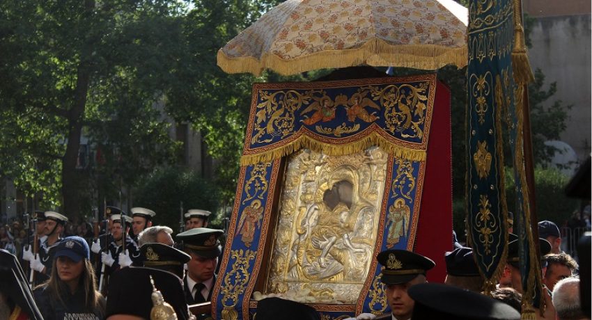 Με τη συνοδεία μελών της ιερής κοινότητας της Μοναστικής Πολιτείας, τελέστηκε η επίσημη υποδοχή της ιερής εικόνας της Παναγίας «Άξιον Εστι», στην πλατεία της Μητρόπολης Αθηνών, παρουσία του Αρχιεπισκόπου Αθηνών και πάσης Ελλάδος Ιερωνύμου και εκπροσώπων της πολιτικής και πολιτειακής ηγεσίας.