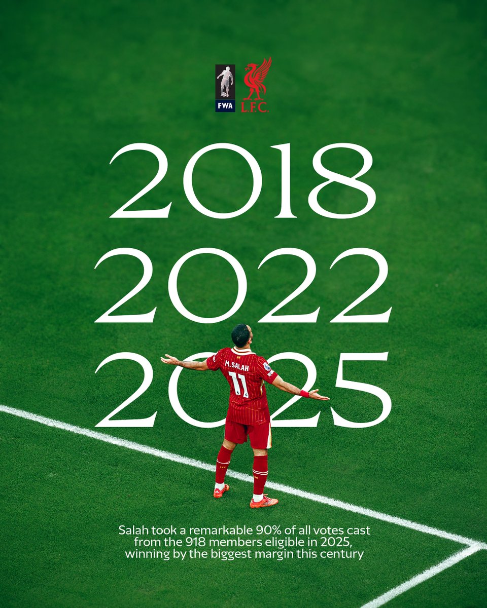 Ο Αιγύπτιος τα… έσπασε για ακόμη μία φορά στο Νησί, καταγράφοντας 28 γκολ και 18 ασίστ σε 35 εμφανίσεις. Με τους «κόκκινους» να κατακτούν με άνεση το φετινό πρωτάθλημα ο Σαλάχ πήρε πανάξια αυτόν τον τίτλο και μάλιστα με ποσοστό 90% από τα 918 μέλη που ψήφισαν, με αποτέλεσμα να γίνει ο νικητής με το μεγαλύτερο ποσοστό στο 21ο αιώνα στην Αγγλία.