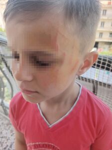 Tο νήπιο έχει αμυχές στο μέτωπο και σε άλλα σημεία του προσώπου του. Ανέφερε στη μητέρα του ότι του επιτέθηκαν πολλά παιδιά και ισχυρίστηκε ότι νωρίτερα του είχαν ζητήσει «να βγάλει τα ρούχα του»!