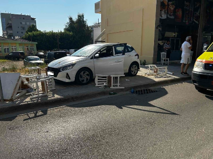 Είναι πραγματικά ευτύχημα το γεγονός ότι ουδείς εκείνη την ώρα δεν καθόταν σε κάποιο από τα τραπέζια πάνω στα οποία και το ΙΧ έπεσε και παρέσυρε για αρκετά μέτρα.