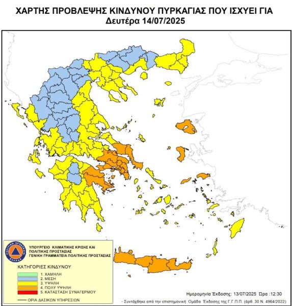 Πολύ υψηλός κίνδυνος πυρκαγιάς (κατηγορία κινδύνου 4) προβλέπεται για σήμερα Δευτέρα 14 Ιουλίου σε αρκετές περιοχές της χώρας, σύμφωνα με τον Χάρτη Πρόβλεψης Κινδύνου Πυρκαγιάς που εκδίδει η γενική γραμματεία Πολιτικής Προστασίας του υπουργείου Κλιματικής Κρίσης & Πολιτικής Προστασίας (civilprotection.gov.gr).