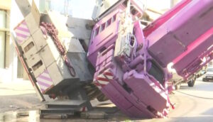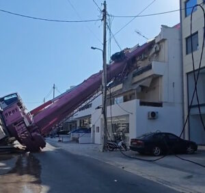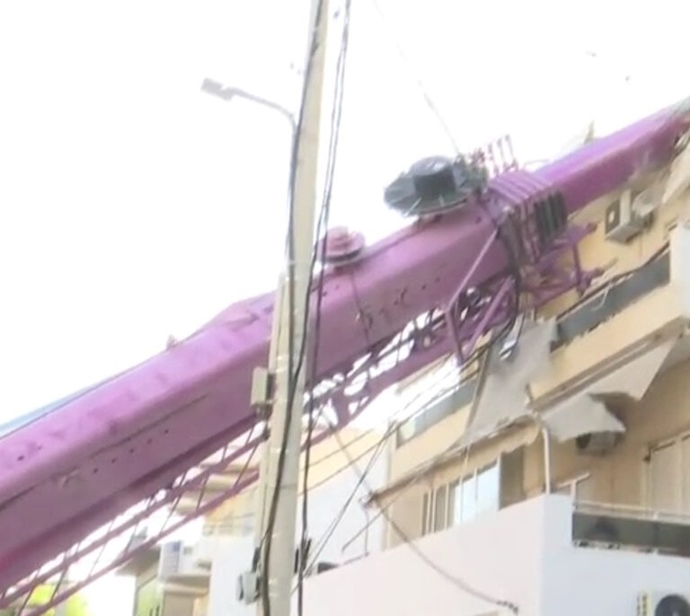 Τότε ο μεγάλος γερανός πήρε απότομη κλίση και έπεσε πάνω στη διώροφη πολυκατοικία.