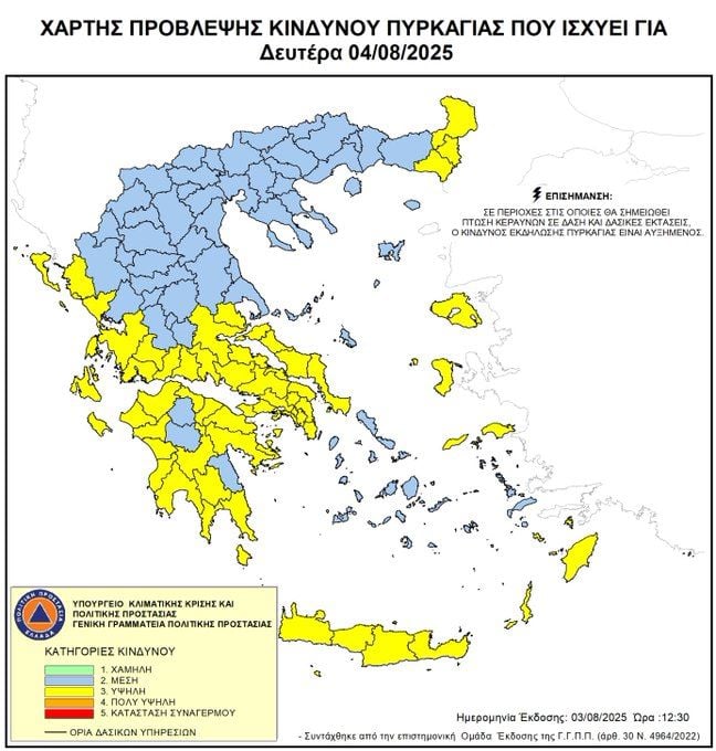 Υψηλός κίνδυνος πυρκαγιάς (κατηγορία κινδύνου 3) προβλέπεται για σήμερα Δευτέρα 4 Αυγούστου σε αρκετές περιοχές της χώρας, σύμφωνα με τον Χάρτη Πρόβλεψης Κινδύνου Πυρκαγιάς που εκδίδει η γενική γραμματεία Πολιτικής Προστασίας του υπουργείου Κλιματικής Κρίσης & Πολιτικής Προστασίας.