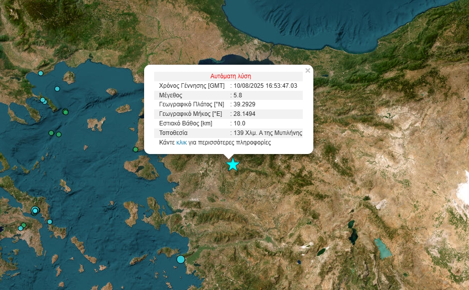 Σεισμός 5,8 Ρίχτερ συγκλόνισε στις 7:53 το απόγευμα της Κυριακής (10.08.2025) την Τουρκία και έγινε αισθητός στη Λέσβο αλλά και στην Κωνσταντινούπολη, όπως μεταδίδουν τουρκικά μέσα ενημέρωσης.Ο σεισμός των 5,8 Ρίχτερ – σύμφωνα με την αυτόματη λύση του Γεωδυναμικού Ινστιτούτου του Εθνικού Αστεροσκοπείου Αθηνών – σημειώθηκε σε απόσταση 139 χιλιομέτρων ανατολικά από τη Λέσβο στη δυτική Τουρκία.