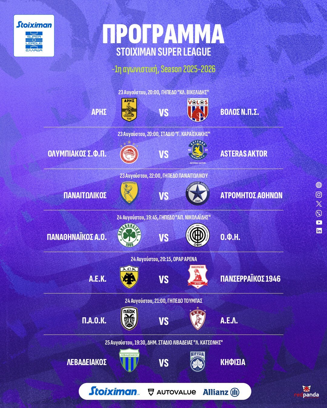 Παράλληλα, την ίδια ημέρα θα διεξαχθεί και το ματς του Παναιτωλικού με τον Ατρόμητος, στις 22:00. Ενώ την Κυριακή (24/08) θα γίνουν οι αγώνες Παναθηναϊκός-ΟΦΗ (19:45), ΑΕΚ-Πανσερραϊκός (20:15) και ΠΑΟΚ-Λάρισα (21:00).