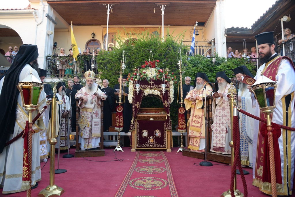 Τήν ἱερά Εἰκόνα τῆς Παναγίας, ἐκράτησε στά χέρια του κατά τήν Ἱερά Λιτανεία, ὁ πολιός καί σεβάσμιος Ἡγούμενος τῆς Ἱερᾶς Μονῆς π. Συμεών, ἐνῶ συμμετεῖχαν οἱ Πατέρες τῆς Ἱερᾶς Μονῆς καί πολλοί ἂλλοι Κληρικοί τῆς Ἱερᾶς Μητροπόλεως.