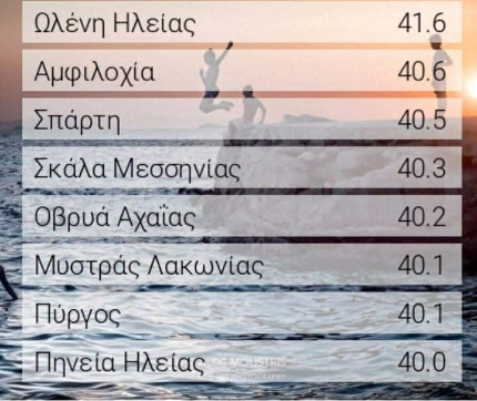 Πρωταθλήτρια ζέστης αναδείχθηκε η Δυτική Ελλάδα, χθές καθώς στις 8 περιοχές της χώρας με την μεγαλύτερη θερμοκρασία Αχαΐα, Ηλεία και Αιτωλοακαρνανία είχαν τις 5 υψηλότερες, όπως φαίνεται και στον σχετικό πίνακα:
