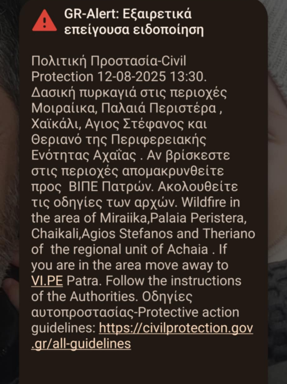 Μήνυμα του 112 για εκκένωση της Κάτω Αχαΐας.