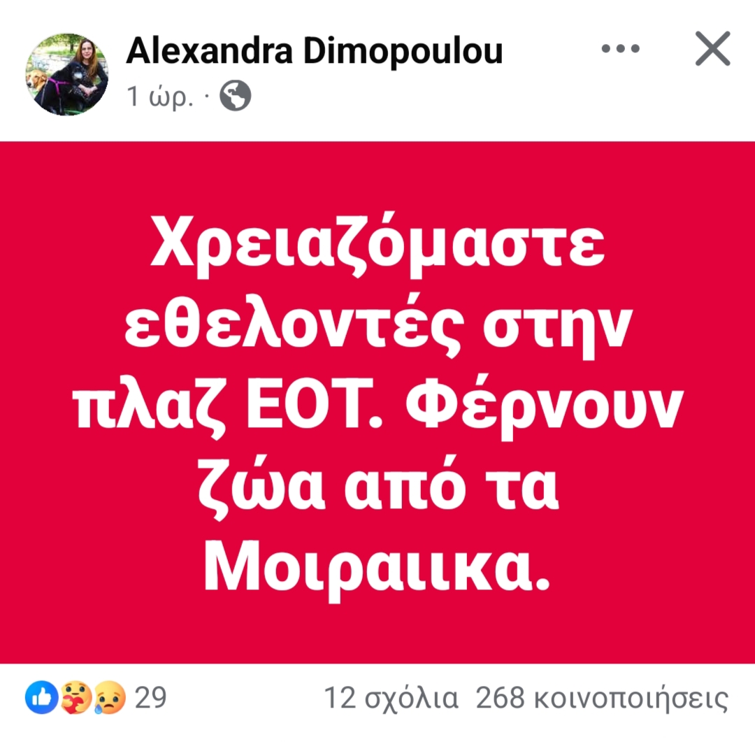 Έκκληση για εθελοντές απηύθυνε η Αλεξάνδρα Δημοπούλου, προκειμένου να συνδράμουν στη φροντίδα ζώων που μεταφέρονται στην Πλαζ Πατρών από χωριά του Ερυμάνθου, τα οποία εκκενώθηκαν λόγω της μεγάλης πυρκαγιάς.