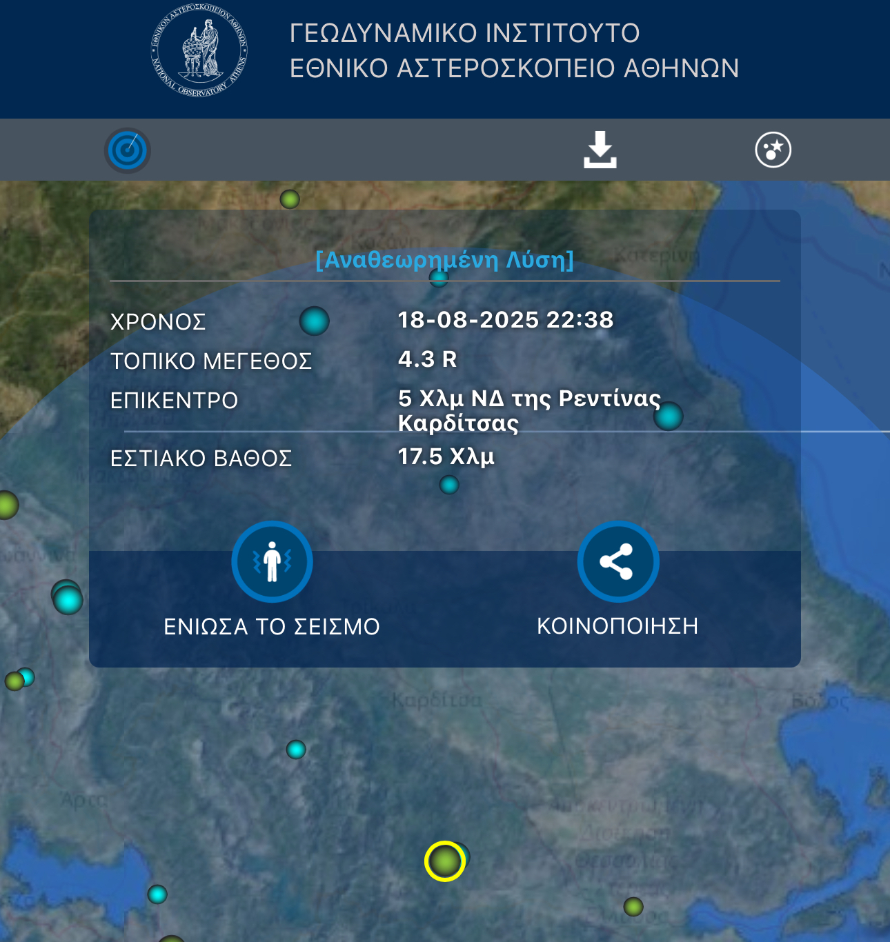 Σεισμός μεγέθους 4,3 βαθμών της κλίμακας Ρίχτερ σημειώθηκε στις 10:38 το βράδυ της Δευτέρας (18.08.2025) κοντά στην Καρδίτσα. Στην περιοχή της Ρεντίνας εντοπίζεται το επίκεντρο.