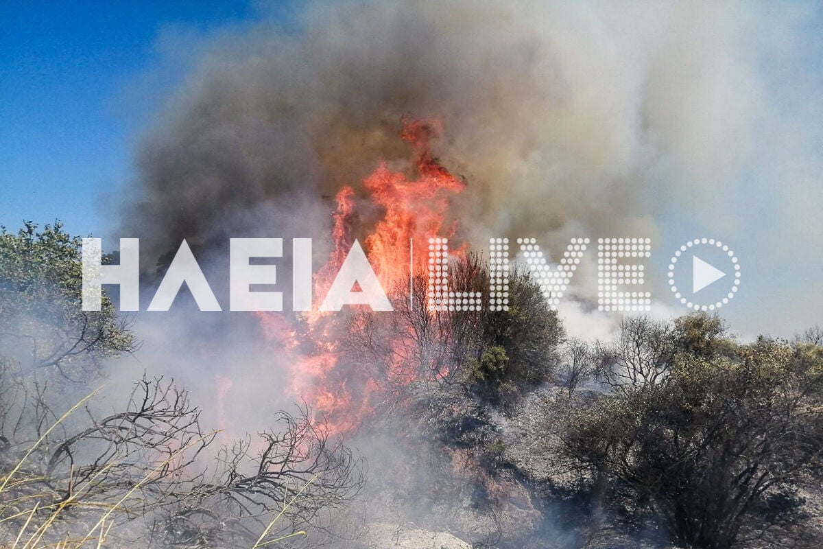 Νεότερη ενημέρωση:;Στην περιοχή επιχειρούν 41 πυροσβέστες, δύο ομάδες πεζοπόρου της 18ης ΕΜΟΔΕ, 13 οχήματα, τρία αεροσκάφη και ένα ελικόπτερο, ενώ συνδρομή υπάρχει από μηχανήματα έργου και υδροφόρες της Π.Ε. Ηλείας και του δήμου Πηνειού.