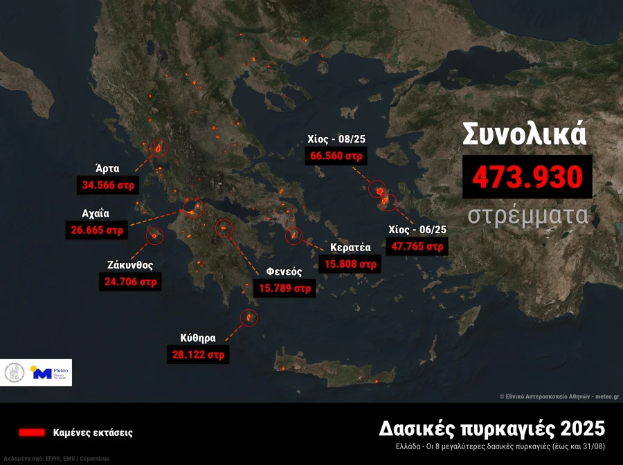 Σύμφωνα με τα στοιχεία του Ευρωπαϊκού Συστήματος Πληροφοριών για τις Δασικές Πυρκαγιές (EFFIS) που ανέλυσε το Εθνικό Αστεροσκοπείο Αθηνών / meteo.gr, από την αρχή του έτους έως και τα τέλη Αυγούστου κάηκαν συνολικά 473.930 στρέμματα, γεγονός που κατατάσσει το 2025 στην πέμπτη χειρότερη χρονιά από το 2006, σε επίπεδο δασικών πυρκαγιών.