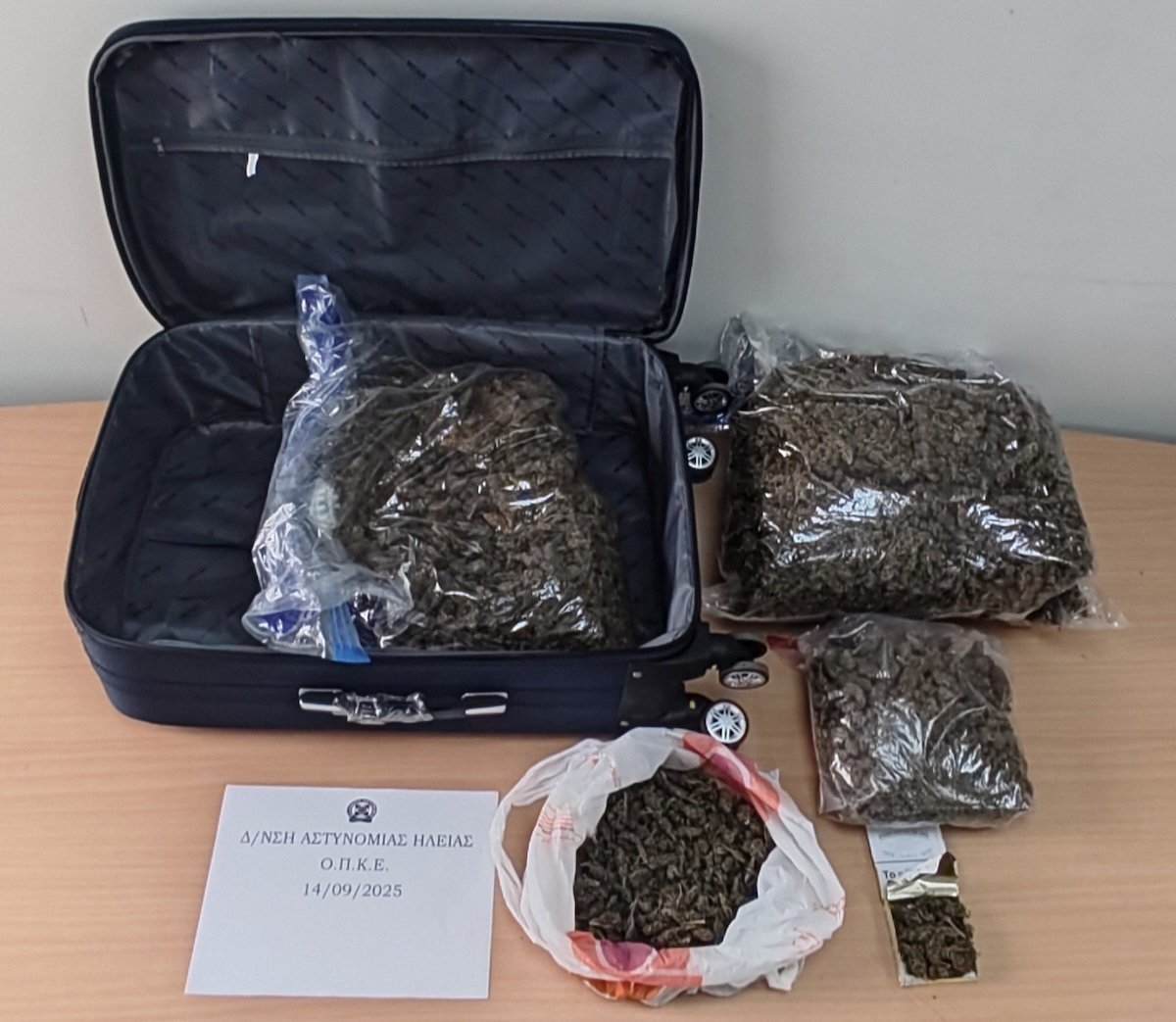 Ειδικότερα, σε αστυνομικό έλεγχο που ενήργησαν οι αστυνομικοί της ΟΠΚΕ σε όχημα που επέβαιναν οι δύο κατηγορούμενοι, εντόπισαν και κατάσχεσαν τέσσερις νάιλον συσκευασίες και ένα πακέτο τσιγάρων που είχε τοποθετήσει μέσα σε βαλίτσα και περιείχαν συνολικά -5- κιλά και -899,8- γραμμάρια κάνναβης, καθώς και δύο κινητά τηλέφωνα.