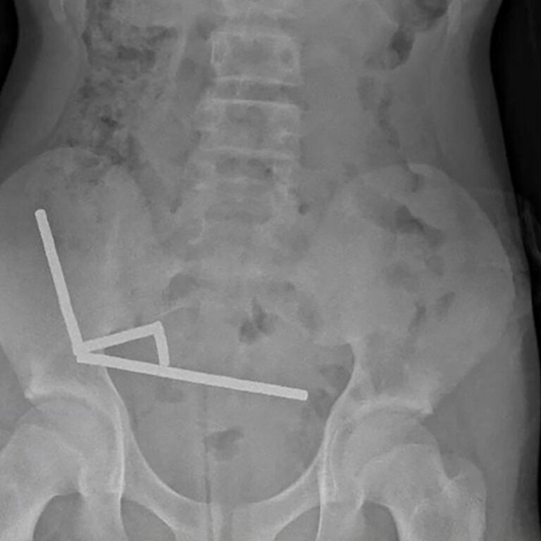 Η ακτινογραφία έδειξε ότι οι μαγνήτες είχαν συγκεντρωθεί σε τέσσερις ευθείες γραμμές μέσα στα έντερα του παιδιού, όπως φάνηκε και στην ακτινογραφία.