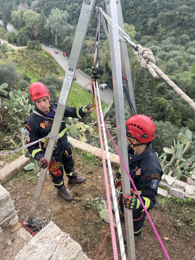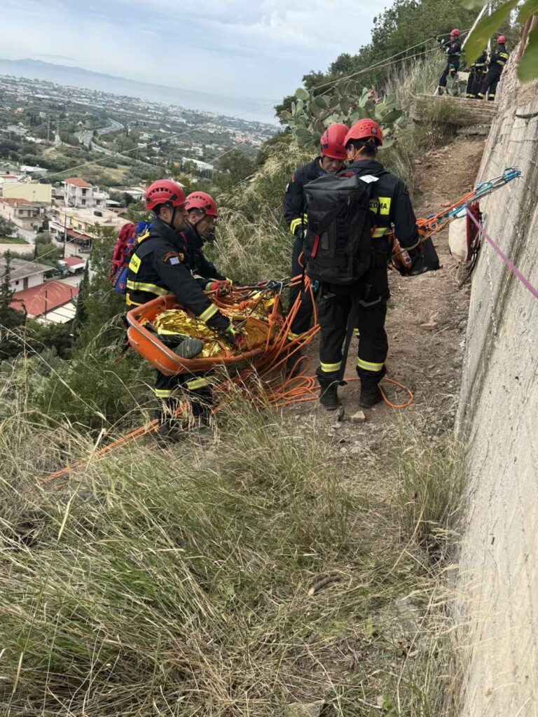 Ταυτόχρονα η 2η Ορειβατική Ομάδα Έρευνας και Διάσωσης (Ο.Ο.Ε.Δ) και με αντίστοιχες ενέργειες εντοπίζει τον πιο σοβαρά τραυματισμένο, ο οποίος χαρακτηρίζεται ως πολυτραυματίας. Με συντονισμένους χειρισμούς, την χρήση ειδικού ορειβατικού εξοπλισμού και την εφαρμογή της μεθόδου της «κεκλιμένης» (σε επικλινές πεδίο που προσεγγίζει τα 100 μέτρα σε μήκος), μετακινείται με φορείο σε ασφαλές σημείο και παραδίδεται σε ασθενοφόρο του Ε.Κ.Α.Β.