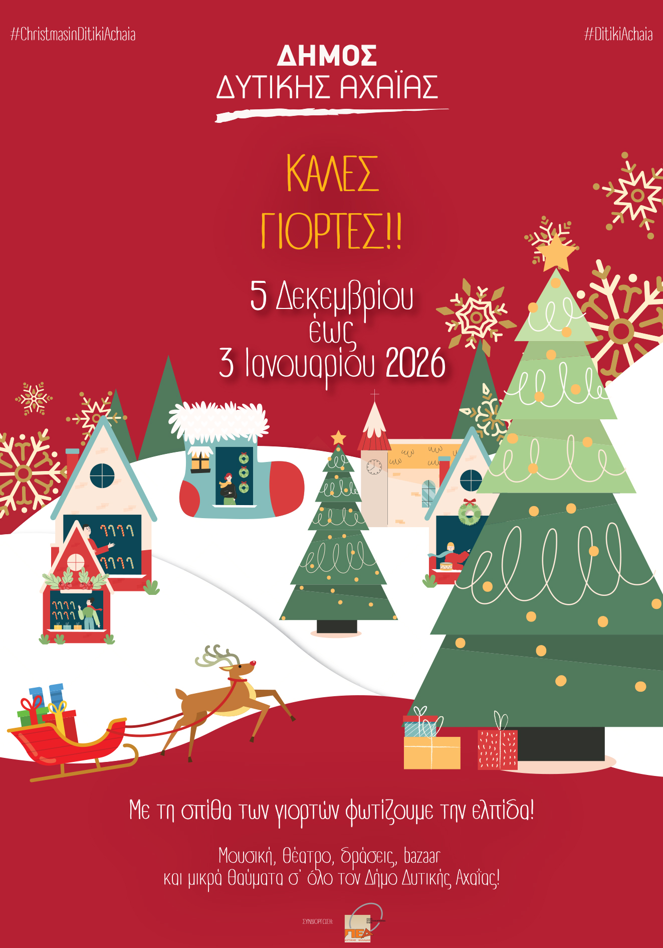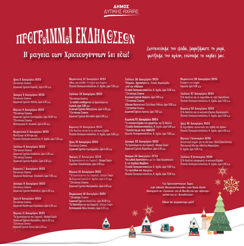 Μ’ ένα πλούσιο, λαμπερό και δημιουργικό πρόγραμμα εκδηλώσεων σε όλες σχεδόν τις Δημοτικές Κοινότητες με επίκεντρο το Χριστουγεννιάτικο Χωριό στην Κάτω Αχαΐα, ο Δήμος Δυτικής Αχαΐας υποδέχεται τη φετινή εορταστική περίοδο, προσκαλώντας μικρούς και μεγάλους να ζήσουν τη μαγεία των Χριστουγέννων και της Πρωτοχρονιάς.