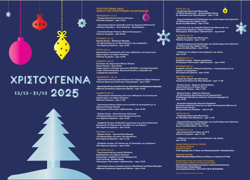 Με το άναμμα του Χριστουγεννιάτικου δέντρου στις 6.00 το απόγευμα της Παρασκευής 12 Δεκεμβρίου, ξεκινούν οι εκδηλώσεις που διοργανώνει και φέτος ο Δήμος της Πάτρας για τα Χριστούγεννα και την Πρωτοχρονιά.