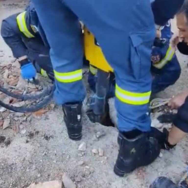 Οι πυροσβέστες με χειρουργικές κινήσεις, πραγματοποίησαν μία μικρή τρύπα στο τσιμέντο της επιφάνειας και κατάφεραν να το προσεγγίσουν στην επιφάνεια αφού το βάθος ευτυχώς δεν ήταν μεγάλο.