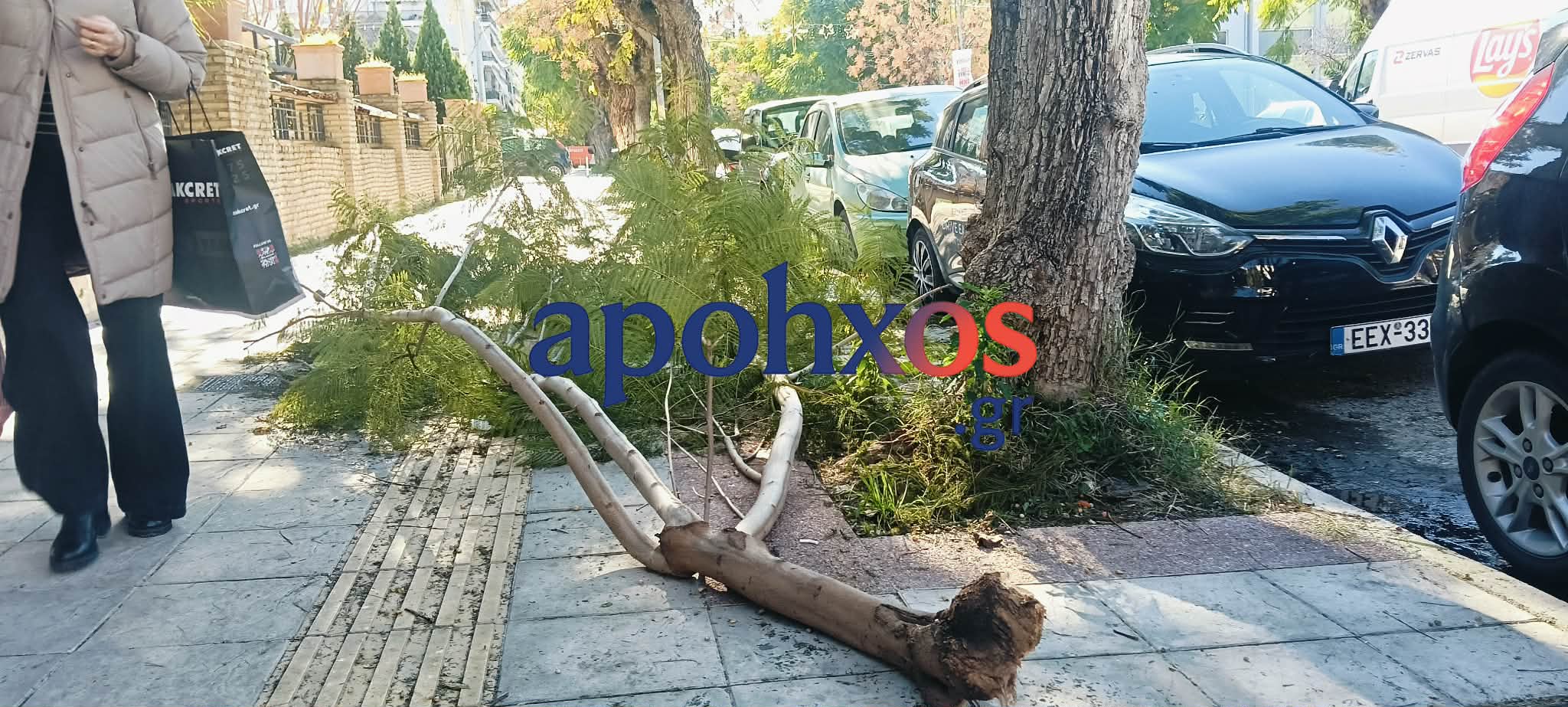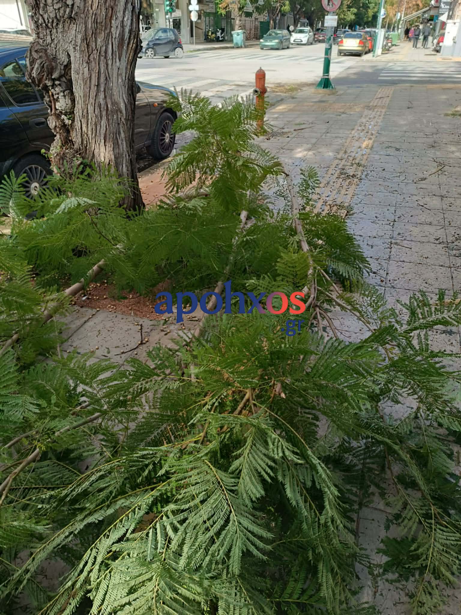 Δεν φτάνει όμως μόνο το συμβάν, αλλά από το Σάββατο έως και σήμερα, Τρίτη, το τεράστιο κλαδί παραμένει πεσμένο στο πεζοδρόμιο, αποτελώντας σαφή και συνεχιζόμενο κίνδυνο.