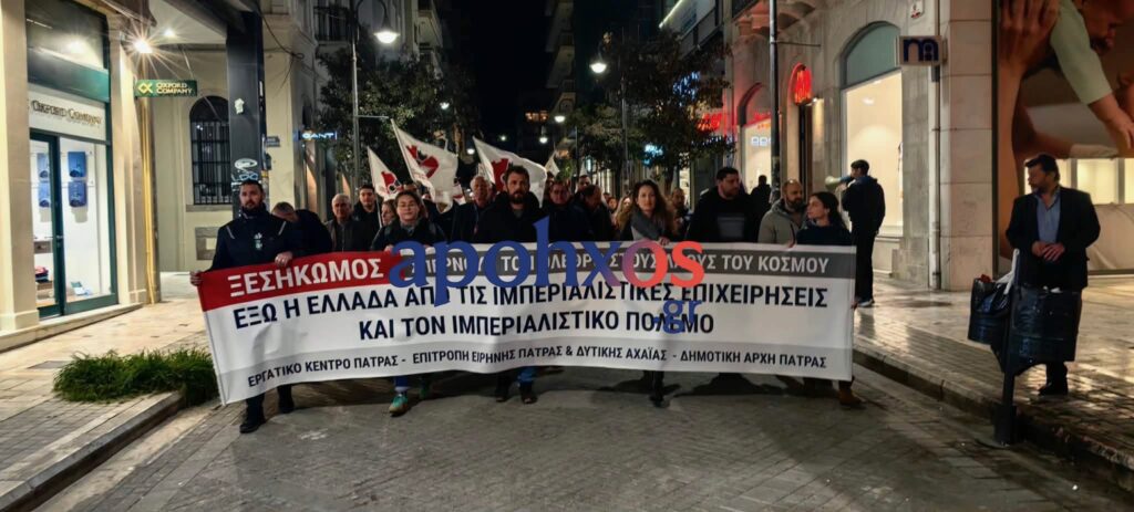 Αντιπολεμικό συλλαλητήριο πραγματοποιήθηκε απόψε στους κεντρικούς δρόμους της Πάτρας.Με φόντο τις ραγδαίες εξελίξεις των τελευταίων ωρών στη Μέση Ανατολή, Συνδικάτα και φοιτητικοί σύλλογοι πραγματοποίησαν πορεία στην αχαϊκή πρωτεύουσα ζητώντας να μην εμπλακεί η Ελλάδα στις πολεμικές επιχειρήσεις του ΝΑΤΟ και των Ηνωμένων Πολιτειών της Αμερικής. Στην κινητοποίηση που διοργανώθηκε από το Εργατικό Κέντρο της Πάτρας συμμετείχε και η Δημοτική Αρχή της πόλης.