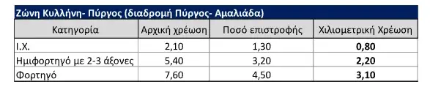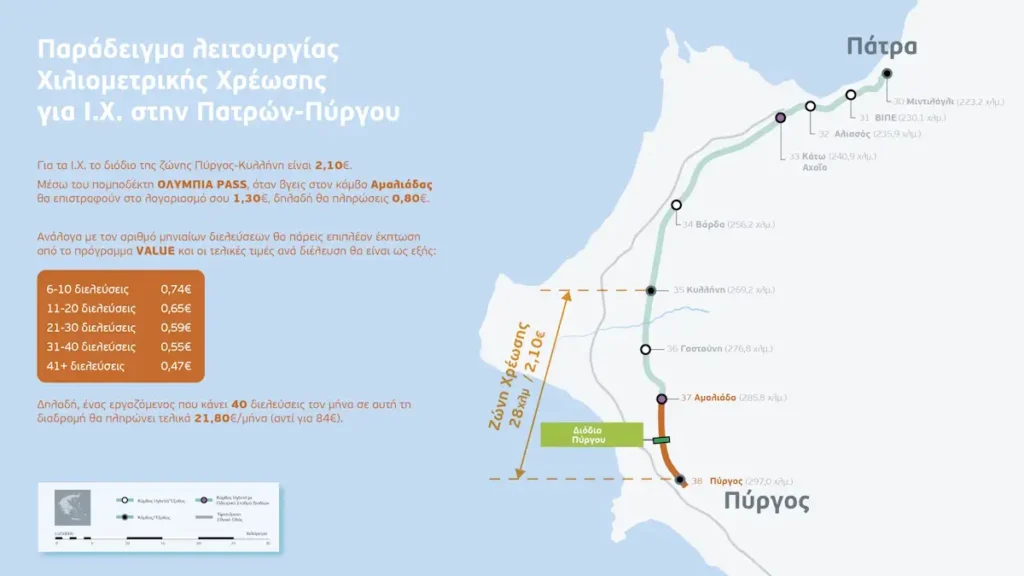 Η Ολυμπία Οδός έχει εφαρμόσει τη χιλιομετρική χρέωση από το 2021 στο τμήμα Ελευσίνα-Κόρινθος-Πάτρα για όλους, Ι.Χ. και επαγγελματικά οχήματα, και τώρα εφαρμόζει το σύστημα σταδιακά στην εθνική οδό Πατρών – Πύργου.