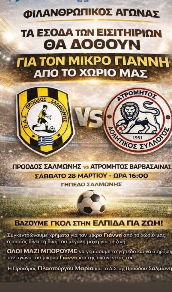 Παράλληλα, η πρωτοβουλία επεκτείνεται και στον αθλητισμό. Το Σάββατο 28 Μαρτίου, στις 16:00, στο γήπεδο της Σαλμώνης θα πραγματοποιηθεί ποδοσφαιρικός αγώνας μεταξύ των ομάδων Πρόοδος Σαλμώνης και Ατρόμητος Βαρβάσαινας. Με σύνθημα «Βάζουμε γκολ στην ελπίδα για ζωή», οι διοργανωτές καλούν τον κόσμο να δώσει δυναμικό «παρών», καθώς τα έσοδα του αγώνα θα διατεθούν για τη στήριξη του παιδιού και της οικογένειας του.