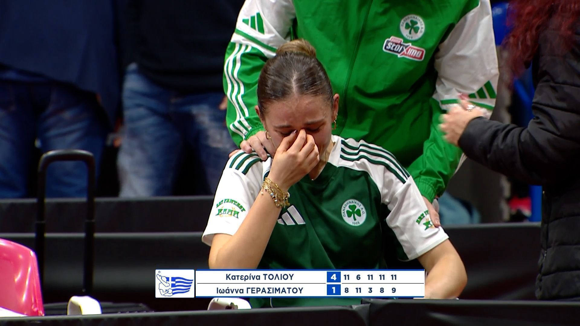Η συμπαίκτριά και φίλη της στον Παναθηναϊκό, Κατερίνα Τόλιου, αλλά αντίπαλος στον τελικό, φρόντισε να ρίξει ρυθμούς και να προσαρμοστεί στο παιχνίδι της Ιωάννας που έπαιζε με δισταγμό κάθε πόντο καθώς πονούσε.