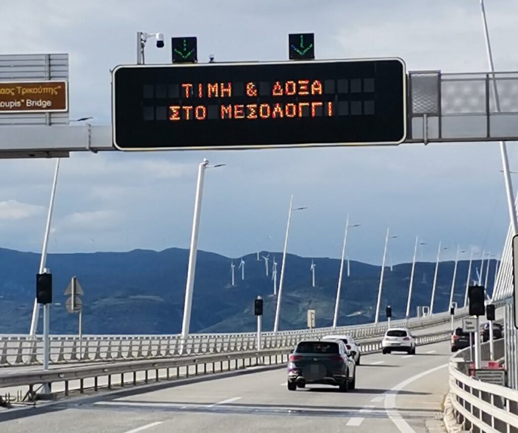 Παράλληλα, από το απόγευμα της Παρασκευής στις 17:00, θα προβάλλεται στη γέφυρα το μήνυμα «Τιμή και Δόξα στο Μεσολόγγι», ενισχύοντας το κλίμα συγκίνησης και εθνικής υπερηφάνειας.