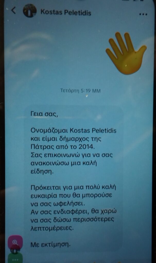 Άγνωστοι προσποιούμενοι τον Δήμαρχο Πατρέων, Κώστα Πελετίδη, επανεμφανίστηκαν αποστέλλοντας προσωπικά μηνύματα σε χρήστες μέσων κοινωνικής δικτύωσης (Facebook κλπ) επιδιώκοντας αρχικά να αποκτήσουν επαφή μαζί τους για να αποσπάσουν προσωπικά δεδομένα (phishing) κλπ.